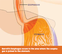 The most common symptom of GERD is heartburn, a condition that 20 percent of American adults experience at least twice a week. Although these individuals are at increased risk of developing esophageal cancer, the vast majority of them will never develop it. In a few patients with GERD (about 10 to 15 percent of patients), a change in the lining of the esophagus develops near the area where the esophagus and stomach join. When this happens, the condition is called Barrett’s esophagus. Doctors believe that most cases of adenocarcinoma of the esophagus begin in Barrett’s esophagus.